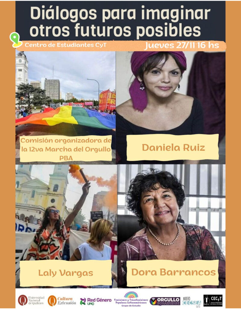 Las actividades están organizadas por: Grupo de Estudios sobre Feminismos y Transfeminismos Populares Latinoamericanos del Departamento de Ciencias Sociales (UNQ); PEU No me callo nada; PEU Géneros, Trabajo y ESS; Diploma de Extensión Universitaria en Prevención y Abordaje de las violencias por motivos de género; Comisión de Mujeres UNQ en articulación con el Programa de Cultura de la Secretaría de Extensión Universitaria (UNQ), el Centro de Estudiantes de CyT (UNQ), el Centro de Estudiantes de Ciencias Sociales y Escuela Universitaria de Artes (UNQ), ADIUNQ, la Red de Género UNQ, Comisión organizadora de la Marcha del Orgullo de la Provincia de Buenos Aires, el Proyecto de Investigación de Economía del Cuidado (DEYA), DiGeS (Discurso Género y Sociedad).