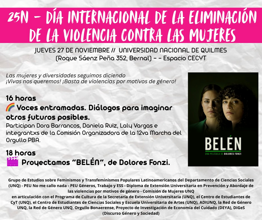 El jueves 27 de noviembre 2025 en el Centro de Estudiantes de Ciencia y Tecnología de la Universidad Nacional de Quilmes (UNQ) con entrada libre y gratuita, se realizarán actividades en el marco del Día Internacional de la Eliminación de la Violencia contra las Mujeres. El 25N, una fecha nacida de la historia latinoamericana y de la memoria encarnada de las hermanas Mirabal, asesinadas por la dictadura de Trujillo en República Dominicana. Y nos proyectamos hacia el 10 de diciembre, Día Internacional de los Derechos Humanos, que nos recuerda que no hay democracia sin igualdad, sin territorios habitables, sin vidas libres de toda forma de violencia.