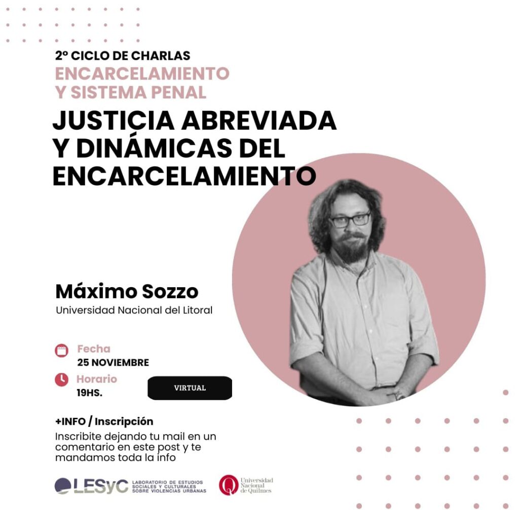 El 25 de noviembre, en modalidad Virtual, se realiza el 2do Ciclo de Charlas Encarcelamiento y Sistema Penal. En esta oportunidad, el especialista de la Universidad Nacional del Litoral, Máximo Sozzo, brindará una exposición sobre Justicia abreviada y Dinámicas Del Encarcelamiento.