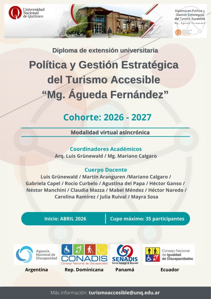 La Universidad Nacional de Quilmes (UNQ) abre la a inscripción a la séptima cohorte del Diploma de Extensión Universitaria en “Política y Gestión estratégica del Turismo Accesible, Mg. Águeda Fernández” que iniciará en el mes de mayo 2026.