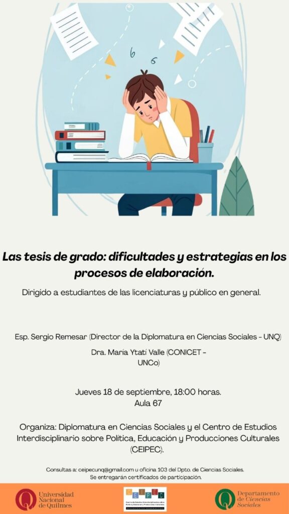 El jueves 18 de septiembre de 2025 a las 18 horas se realizará la charla “Las tesis de grado: dificultades y estrategias en los procesos de elaboración” en el aula 67.