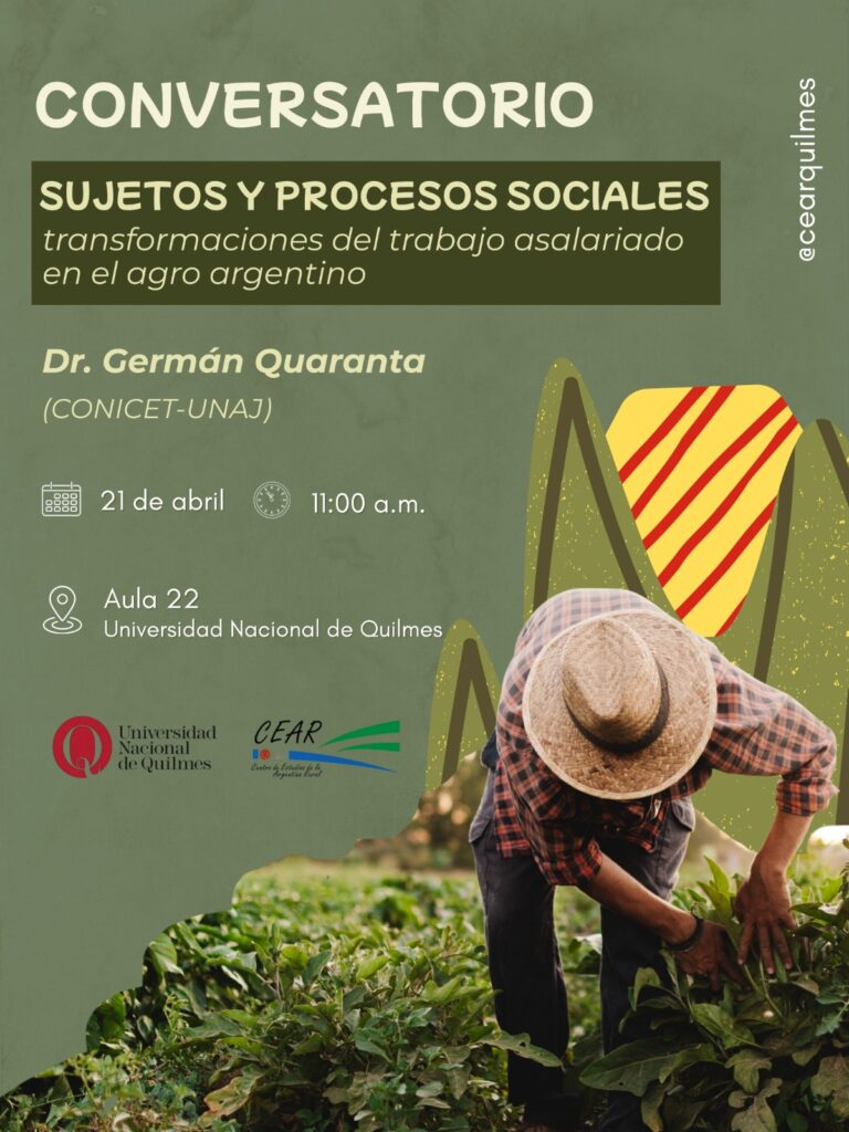El 21 de abril de 2026 se realizará en la Universidad Nacional de Quilmes (UNQ) una nueva charla del Ciclo de Conversatorios organizados por el Centro de Estudios de la Argentina Rural (CEAR).