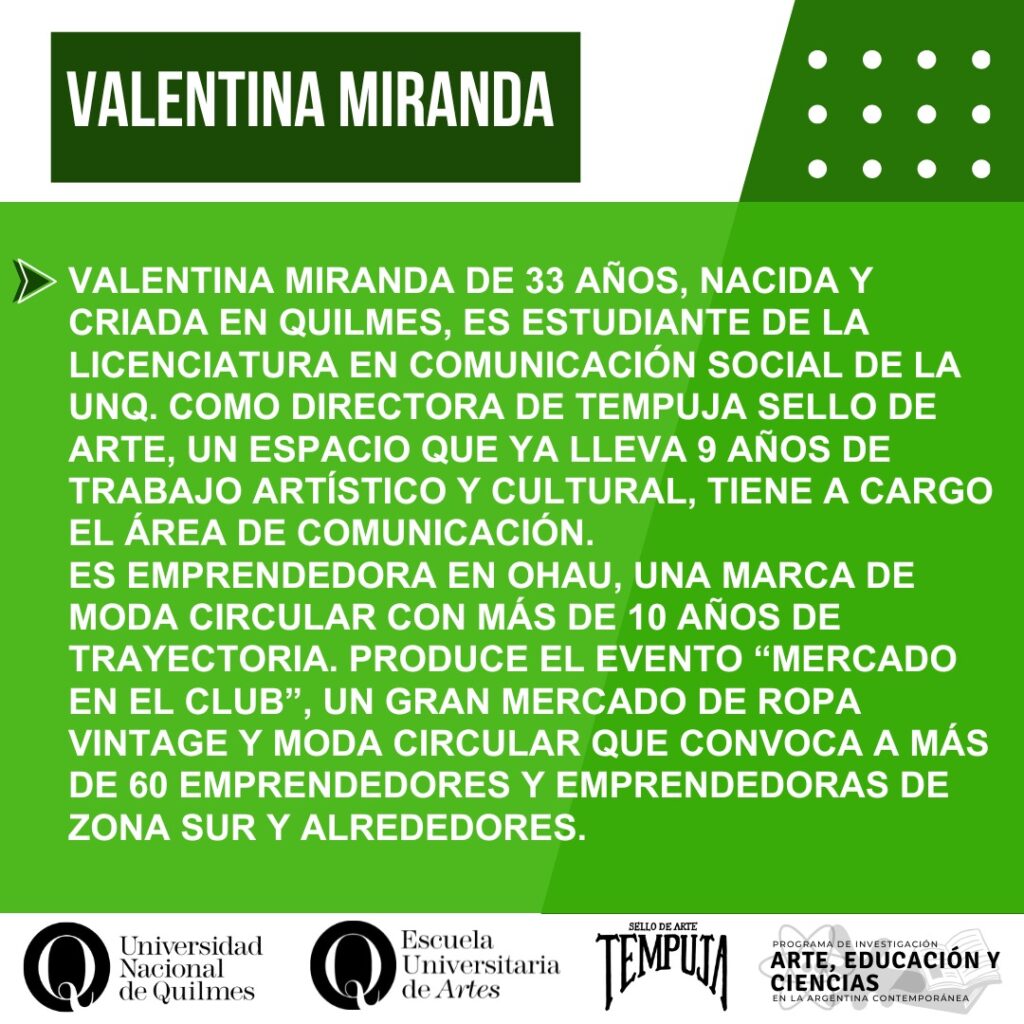 Valentina Miranda: Tiene 33 años, nacida y criada en Quilmes. Estudiante de Comunicación Social (UNQ). Es Directora de Tempuja Sello de Arte, donde tiene a cargo el área de Comunicación. Es emprendedora en Ohau (marca de moda circular) y produce el evento “Mercado en el Club”, un gran mercado de ropa vintage y moda circular en Zona Sur.