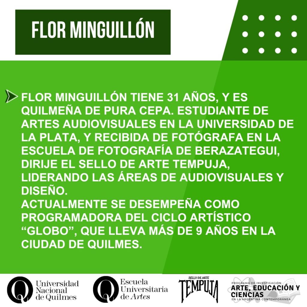 Flor Minguillón: Tiene 31 años, oriunda de Quilmes. Estudiante de Artes Audiovisuales (UNLP) y fotógrafa (Escuela de Fotografía de Berazategui). Dirige el Sello de Arte Tempuja, liderando las áreas de Audiovisuales y Diseño. Actualmente es programadora del ciclo artístico “Globo” en Quilmes.