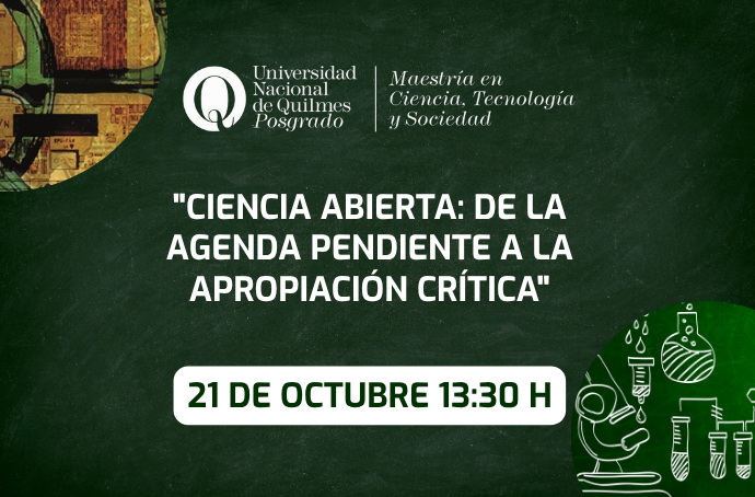 La Maestría en Ciencia, Tecnología y Sociedad invita a participar de la jornada virtual “Ciencia Abierta: De la agenda pendiente a la apropiación crítica”, que se realizará el martes 21 de octubre a las 13:30, a través del canal de YouTube de la Secretaría de Posgrado.