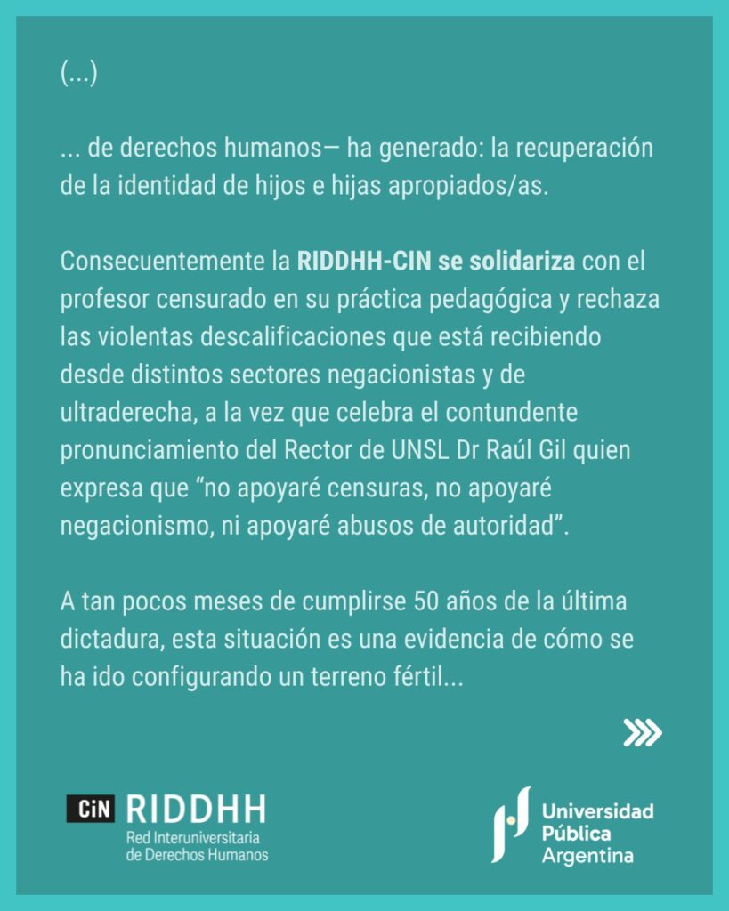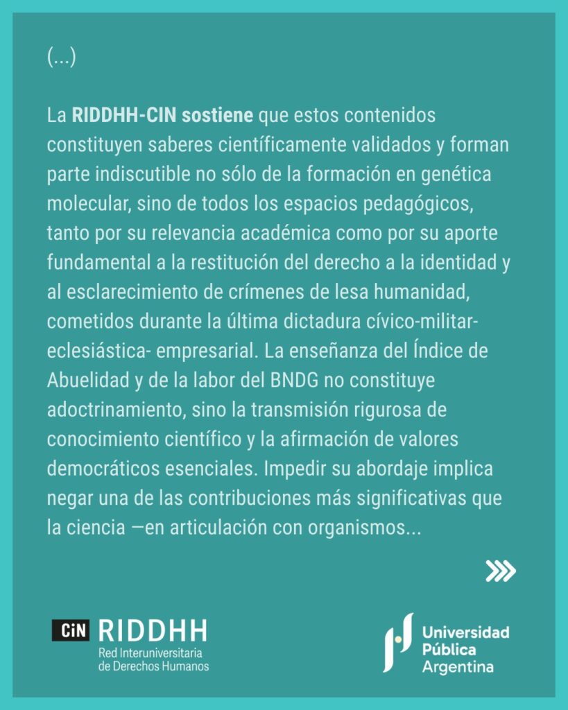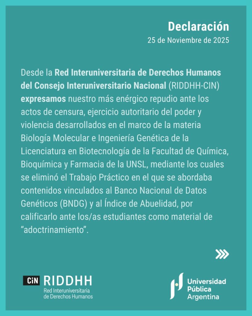 El 25 de noviembre de 2025, la Red Interuniversitaria de Derechos Humanos del Consejo Interuniversitario Nacional (RIDDHH-CIN) emitió un comunicado en repudio a los actos ocurridos en el marco de la materia Biología Molecular e Ingeniería Genética de la Licenciatura en Biotecnología de la UNSL,