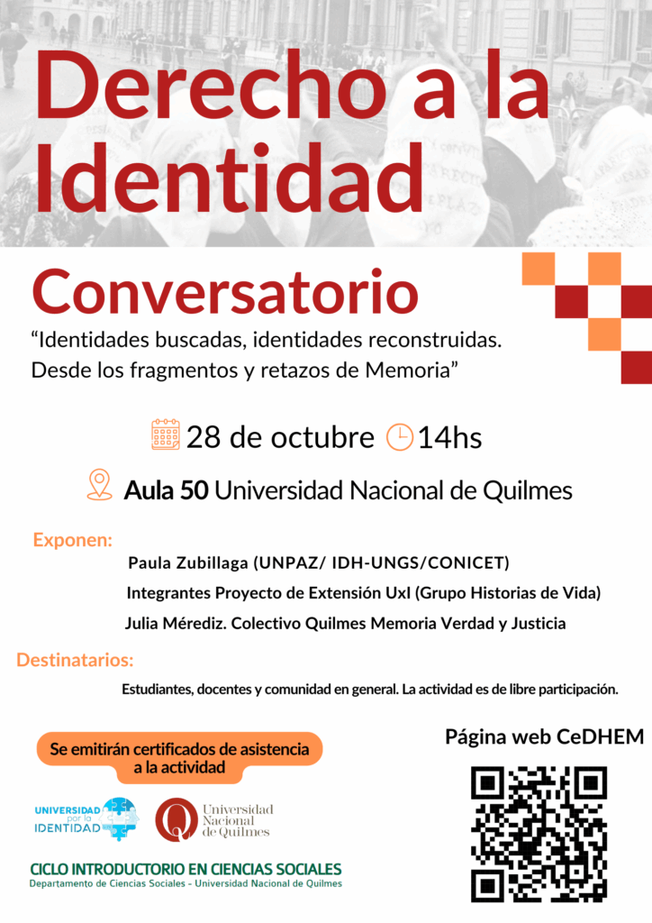 El 28 de octubre de 2025, mes dedicado especialmente al Derecho a la Identidad en Argentina, tendrá lugar el conversatorio “Identidades buscadas, identidades reconstruidas. Desde los fragmentos y retazos de Memoria”, en la Universidad Nacional de Quilmes (UNQ), con la participación especial de la Universidad Nacional de José C. Paz (UNPAZ).