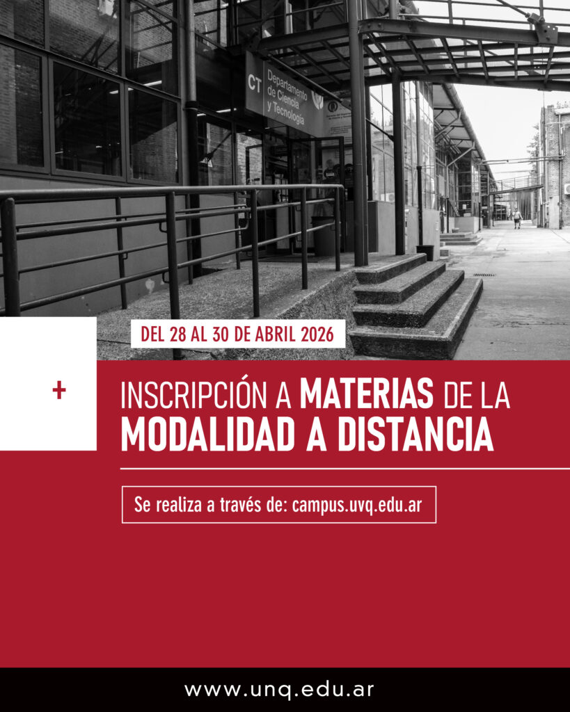 La inscripción a materias para estudiantes de carreras de modalidad a distancia de la Universidad Nacional de Quilmes (UNQ) se realizará del 28 al 30 de abril de 2026 inclusive, a través del Campus Virtual UNQ: https://campus.uvq.edu.ar/