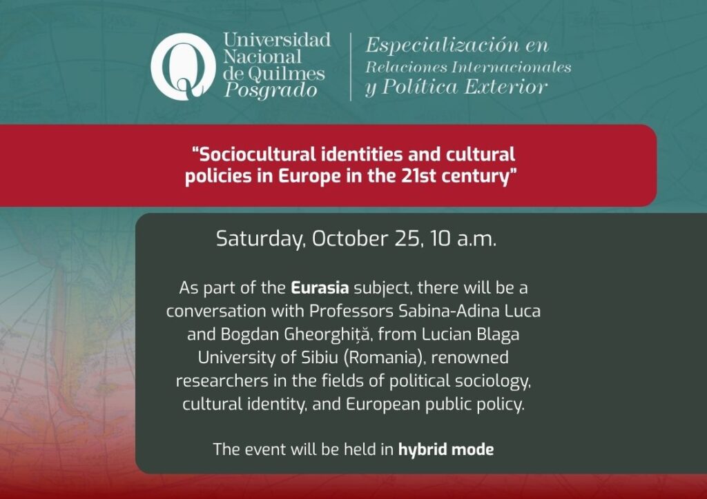 En el marco de la materia Eurasia de la Especialización en Relaciones Internacionales y Política Exterior, las autoridades de la carrera invitan a un conversatorio con los profesores Sabina-Adina Luca y Bogdan Gheorghiță, de la Lucian Blaga University of Sibiu (Rumania).