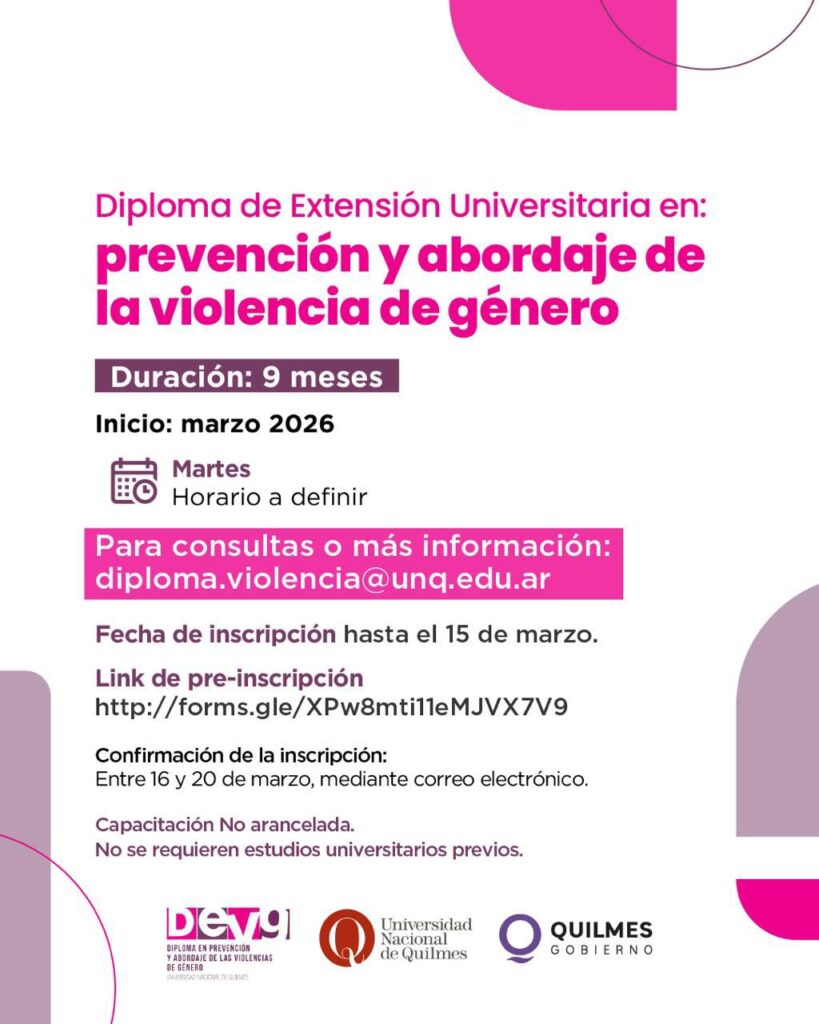Hasta el 15 de marzo se encuentra abierta la pre-inscripción a la cohorte 2026 del Diploma de Extensión Universitaria en abordaje y prevención de las violencias de género, de la Universidad Nacional de Quilmes (UNQ).