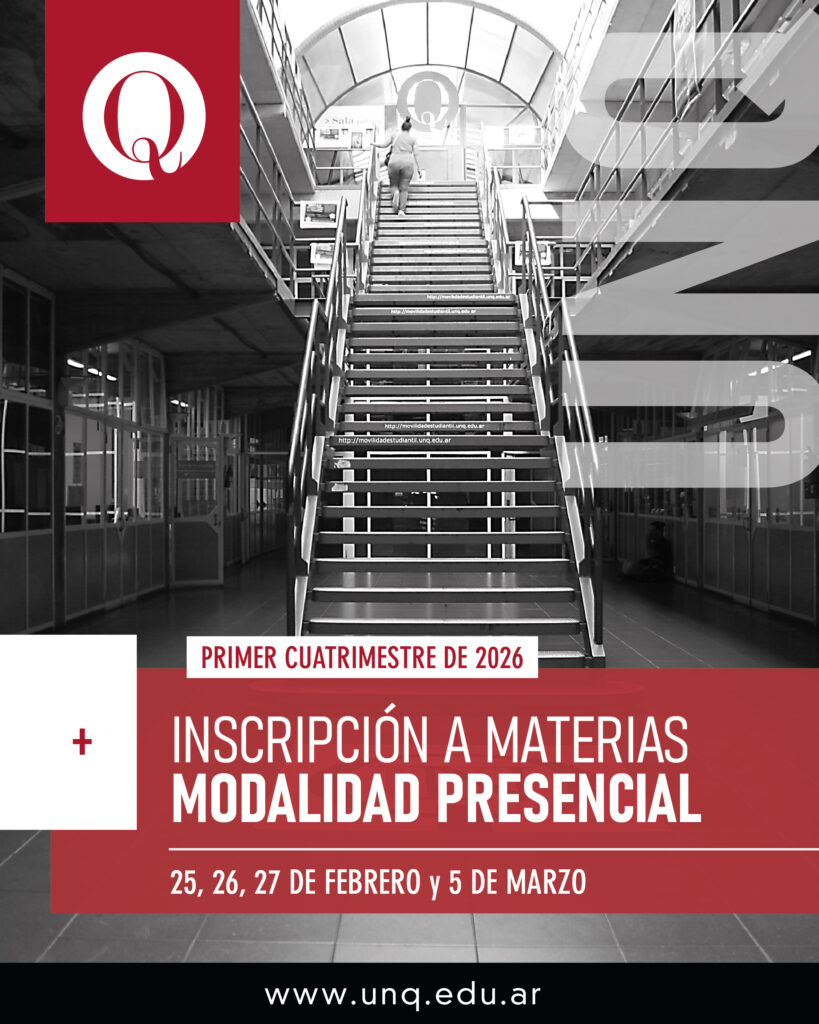 Los días 25, 26 y 27 de febrero y 5 de marzo de 2026, los y las estudiantes de las carreras de modalidad presencial podrán inscribirse a materias para cursar en el primer cuatrimestre de 2026. La inscripción -que se autogestiona en el Campus Virtual UNQ – está organizada en dos instancias. Inicialmente los/as estudiantes podrán inscribirse a dos asignaturas de su carrera. En la segunda instancia, podrán adicionar inscripciones a materias, según la disponibilidad de cursos y las especificidades de cada carrera (se sugiere consultar la información difundida por cada Dirección). Además, aquellos estudiantes que buscan avanzar en sus estudios tienen la opción de cursar materias en la Universidad Nacional de Avellaneda y la Universidad Nacional Arturo Jauretche -de Florencio Varela- en el marco de la propuesta de movilidad conurbana.