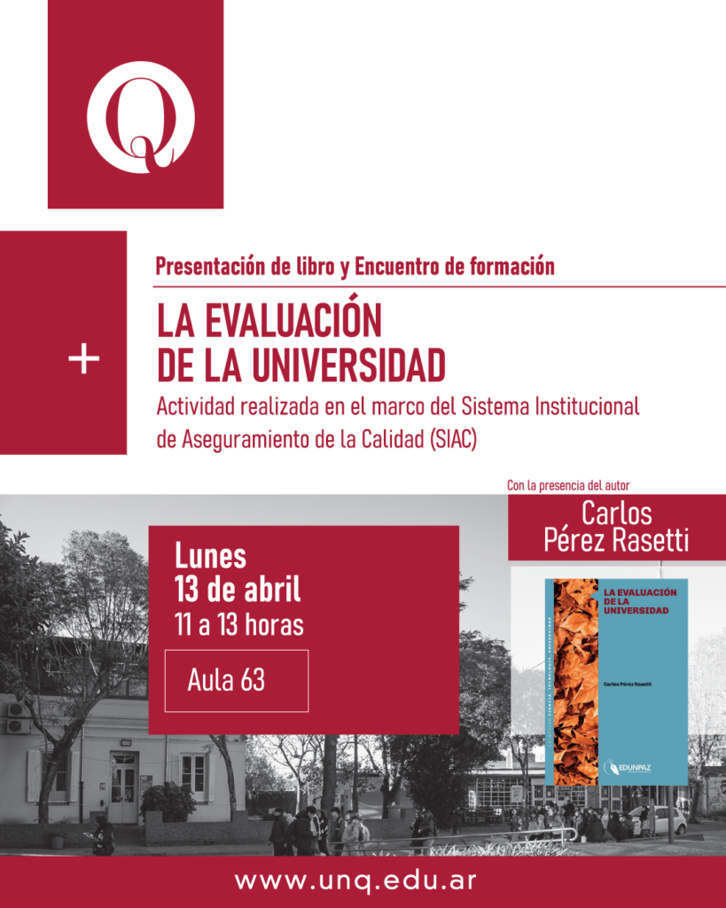 El lunes 13 de abril de 2026 se presentará el libro “La evaluación de la universidad” con la participación de Con Carlos Pérez Rasetti. También habrá un encuentro de formación de 11 a 13 horas en el aula 63 de la Universidad Nacional de Quilmes (UNQ).