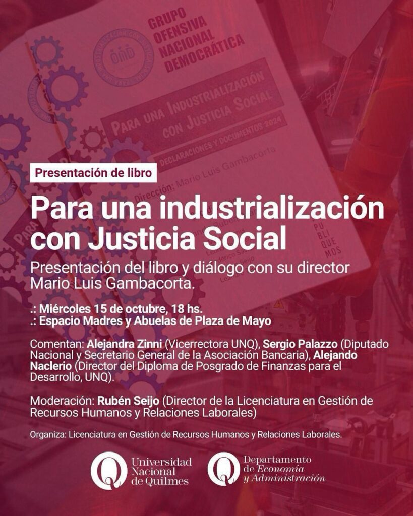 El miércoles 15 de octubre de 2025 se presentará el libro “Para una industrialización con Justicia Social”, en el Espacio Madres y Abuelas de Plaza de Mayo de la Universidad nacional de Quilmes (UNQ). También se podrá dialogar con su Director Mario Luis Gambacorta.