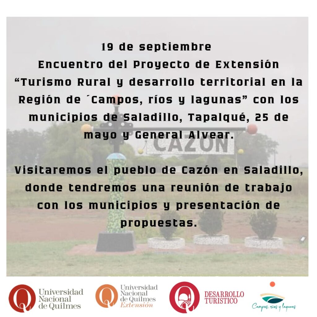 El 19 de septiembre de 2025, el proyecto de extensión de la Universidad Nacional de Quilmes (UNQ) “Turismo rural y desarrollo territorial en la región de Campos, Ríos y Lagunas” participó de una reunión de trabajo en la ciudad de Saladillo junto a referentes de los municipios que integran la región de “Campos, ríos y lagunas”.