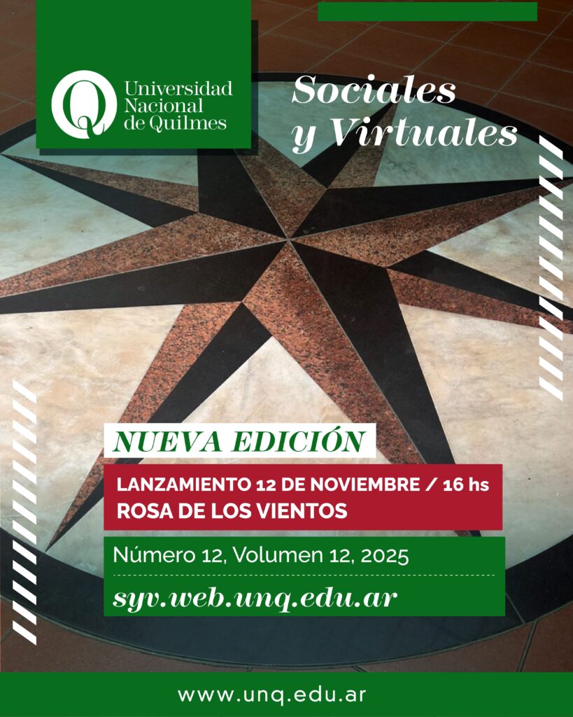El miércoles 12 de noviembre de 2025 a las 16 horas se realizará la presentación del Número 12 de la Revista Sociales y Virtuales del Departamento de Ciencias Sociales de la Universidad Nacional de Quilmes (UNQ).