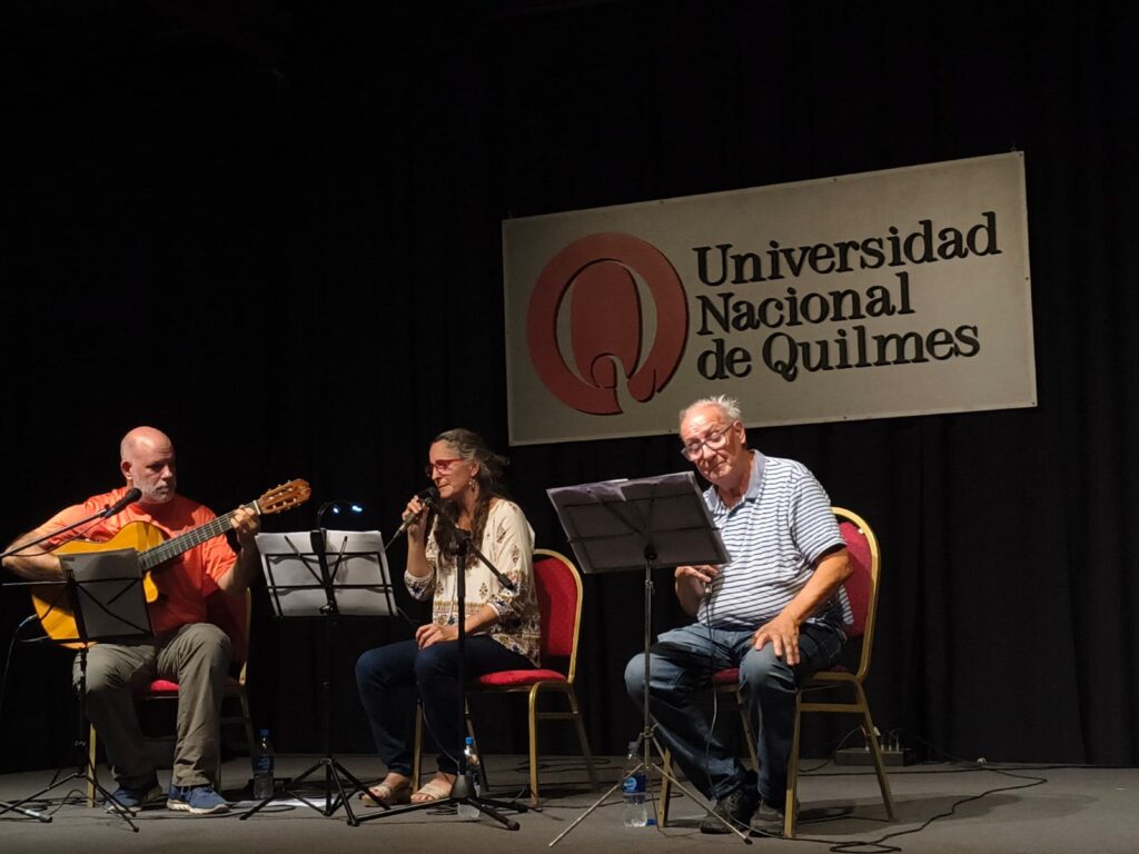 El cierre de la jornada estuvo marcado por la presentación de Pablo Díaz, acompañado por la guitarra y la voz de Pablo Andrés Mini y por la voz de Lucía Benaglia. El trío ofreció una intervención de gran sensibilidad, en la que la poesía, la música y el testimonio se entramaron con singular delicadeza estética. Entre canciones, palabras y memorias compartidas, la propuesta generó un clima profundamente conmovedor, capaz de transmitir, desde una intensidad serena, la vigencia de la memoria como práctica colectiva, pedagógica y política.