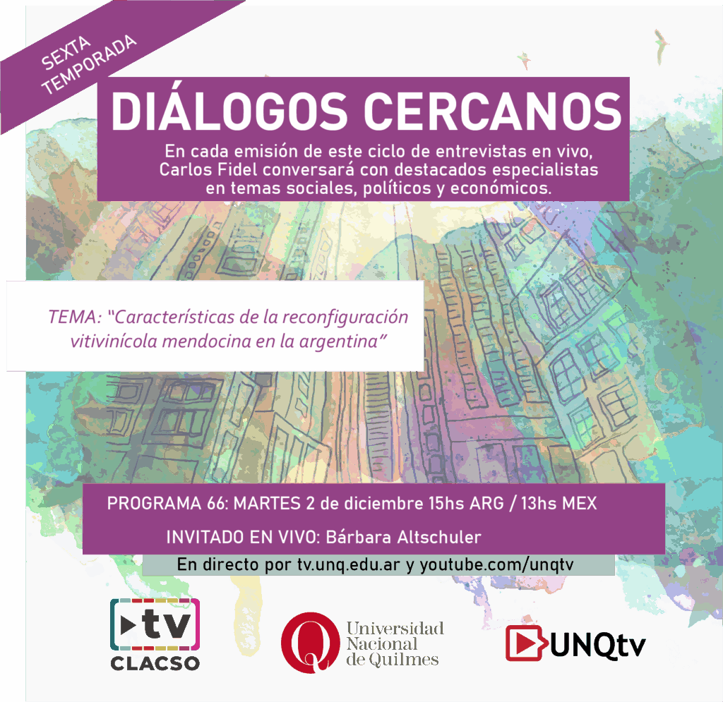 El martes 2 de diciembre de 2025, se hará la última edición de Diálogos cercanos de esta temporada (programa 66), el ciclo de entrevistas de la Universidad Nacional de Quilmes (UNQ). En esta oportunidad, Carlos Fidel entrevistará a Bárbara Altschuler, con quien hablará sobre “Características de la reconfiguración vitivinícola mendocina en la Argentina”