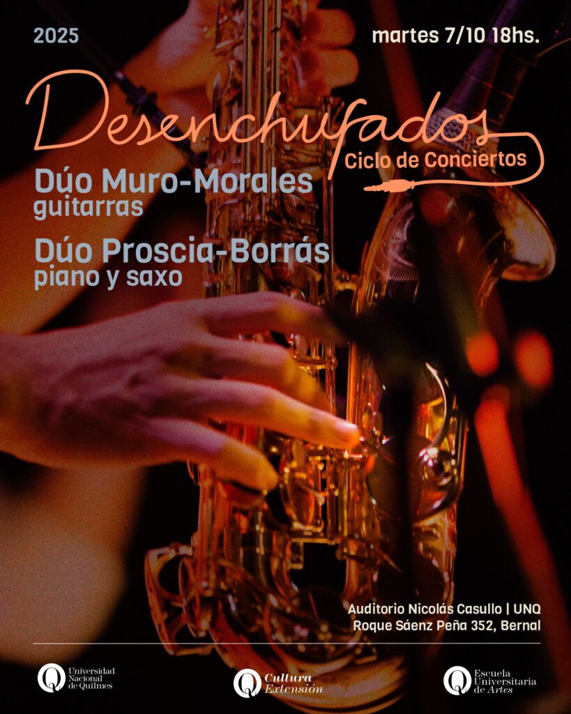 El ciclo de “Conciertos Desenchufados” es un espacio para reflexionar sobre la escucha musical, volviendo hacia la naturaleza del sonido. En su segundo encuentro, que se realizará el martes 7 de octubre en la Universidad Nacional de Quilmes (UNQ), se presentarán el Dúo de guitarras compuesto por Milena Muro y Tayil Morales, y el Dúo de saxo y piano con Martín Proscia y Pablo Borrás.