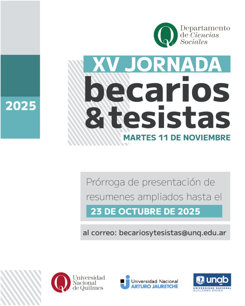 El martes 11 de noviembre de 2025 será la decimoquinta edición de las Jornadas de Becarios y Tesistas del XV Jornada de Becarios y Tesistas del Departamento de Ciencias Sociales. Está dirigida a todos los becarios de Investigación y/o Extensión radicados en el Departamento de Ciencias Sociales o que, teniendo radicación en otras unidades académicas de la UNQ u otras Universidades, desarrollen su formación en campos temático-disciplinares conexos a los de las áreas del Departamento, así como los Tesistas que cursen estudios en grado, especializaciones, maestrías y doctorados de la UNQ vinculadas de igual modo con el Departamento.