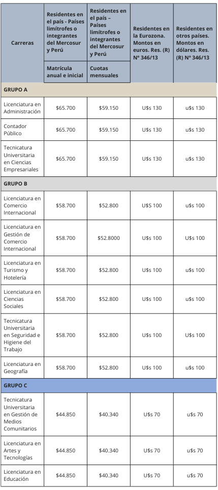 Cada estudiante abona la matrícula de inscripción para ingresar a la carrera. Luego, abonará las cuotas desde el inicio de la cursada y hasta la finalización del año calendario (diciembre de cada año).